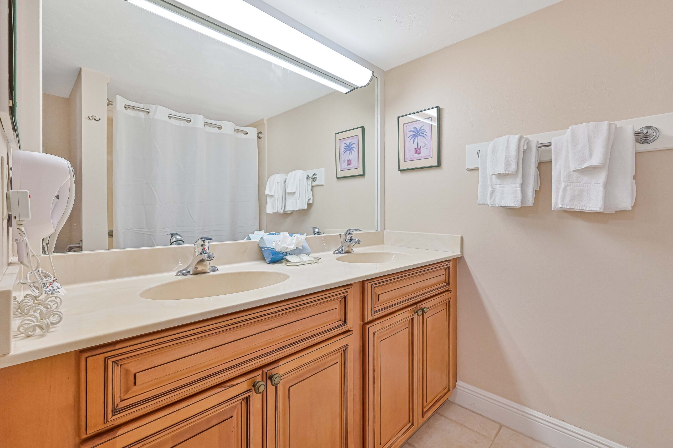 - Guest bedroom with 2 twin beds, dresser, closet. The adjacent bathroom has 2 sinks and tub/shower.